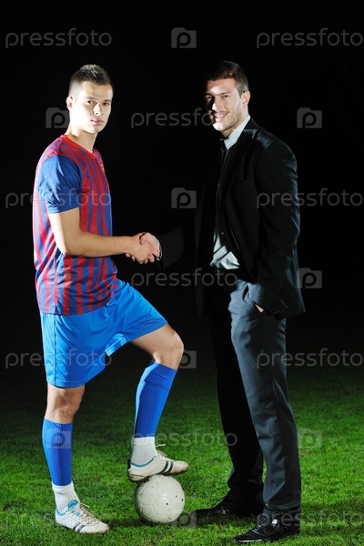 Менеджер в деловом костюме с футболистом на футбольном поле