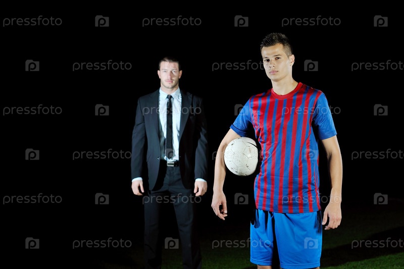 Менеджер в деловом костюме с футболистом на футбольном поле