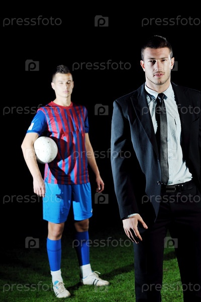 Менеджер в деловом костюме с футболистом на футбольном поле
