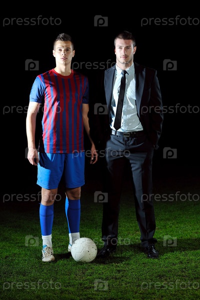 Менеджер в деловом костюме с футболистом на футбольном поле