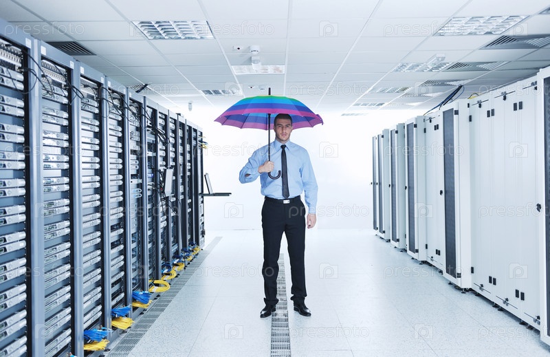 Инженер находится в комнате хранения информации с цветным зонтом в руке