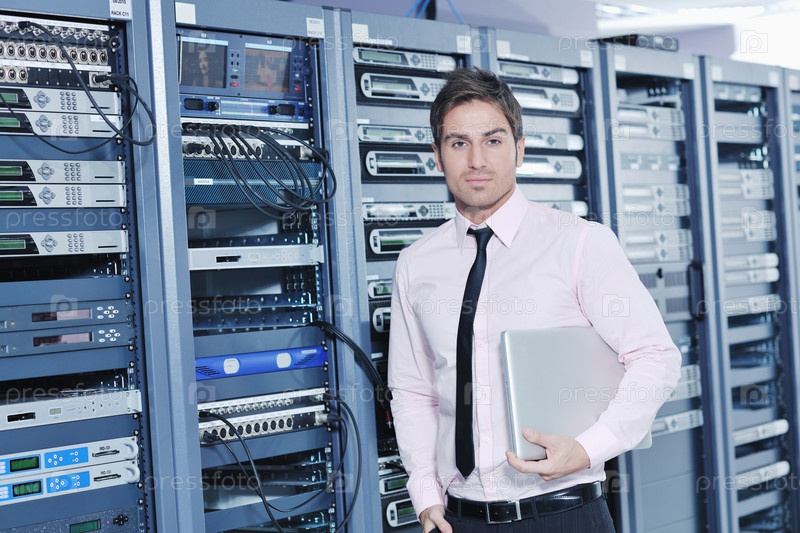 Инженер в серверной комнате пытается наладить работу системы