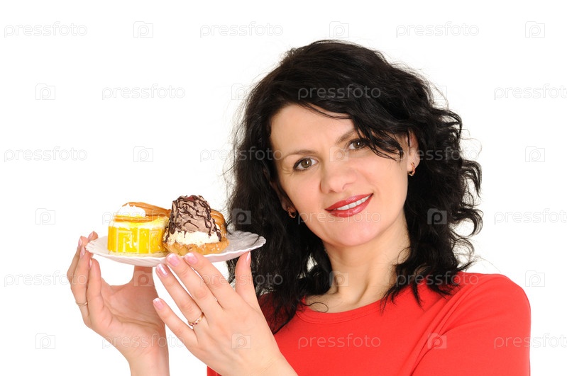 Женщина с губным пирогом на тарелке изолирована на белом фоне
