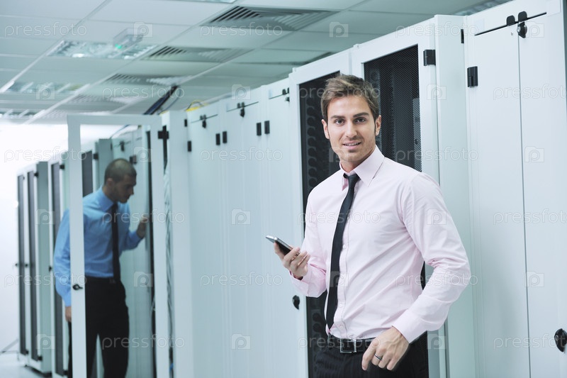 Инженер с телефоном в серверной комнате