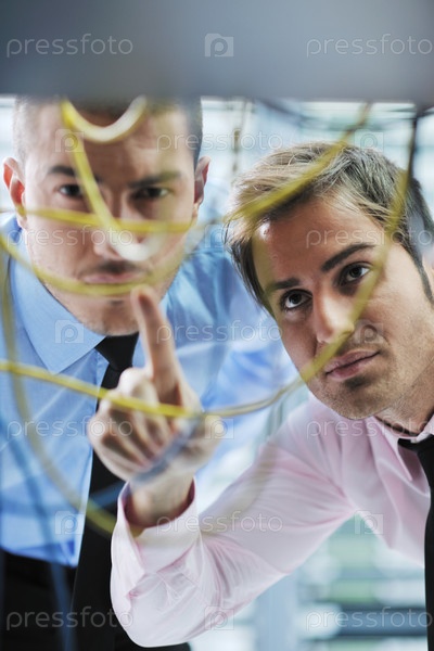 Два инженера в серверной комнате пытаются устранить поломку