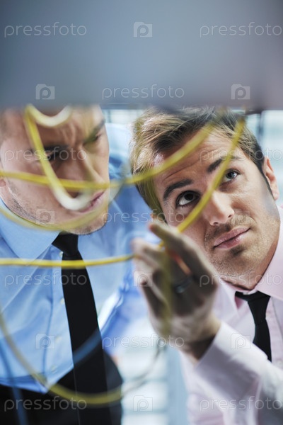 Два инженера в серверной комнате пытаются устранить поломку