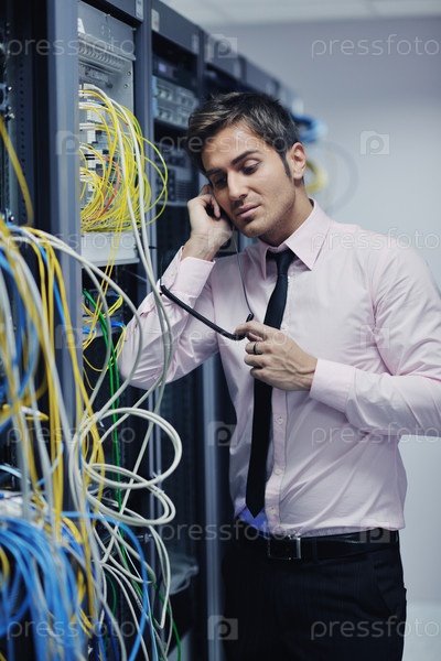 Инженер в серверной комнате звонит по телефону
