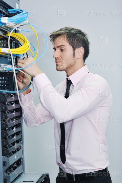 Инженер в серверной комнате пытается устранить неполадки