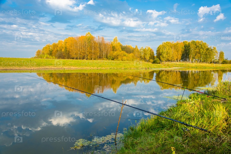 Осенний пейзаж реки с удочками