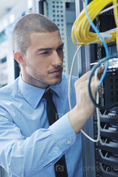 Инженер в серверной комнате пытается устранить неполадки