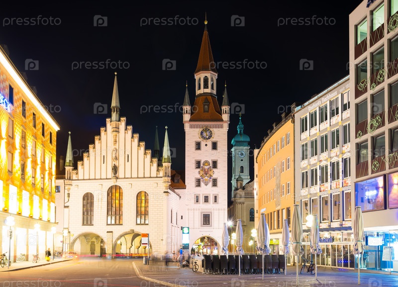 Мариенплац ночью в Мюнхене, Германия. Старая ратуша
