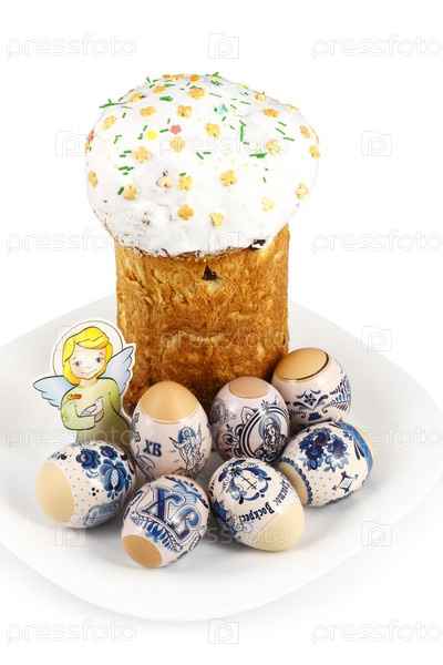 Кулич с пасхальными яйцами на белом фоне