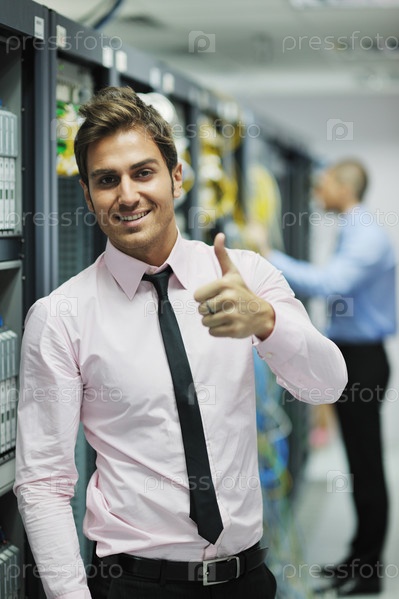 Инженер в серверной комнате показывает знак отлично