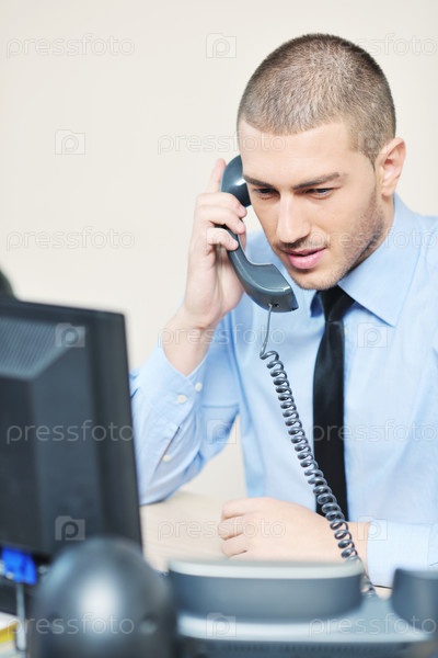 Портрет делового мужчины с телефоном, работающего в центре поддержки клиентов