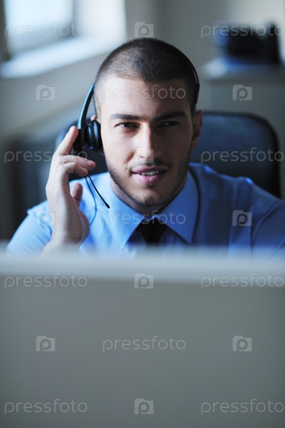 Портрет делового мужчины с гарнитурой, работающего в центре поддержки клиентов