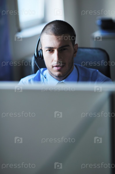 Портрет делового мужчины с гарнитурой, работающего в центре поддержки клиентов
