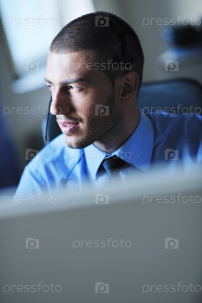 Портрет стильного делового мужчины с гарнитурой в офисе