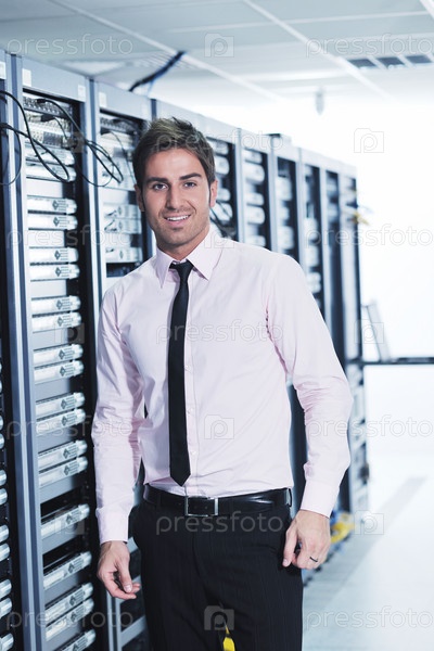 Молодой инженер в серверной комнате центра обработки данных