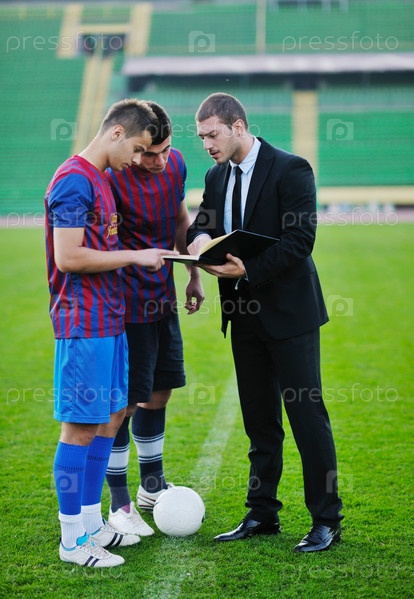 Спортивный менеджер в деловом костюме и футболисты на стадионе