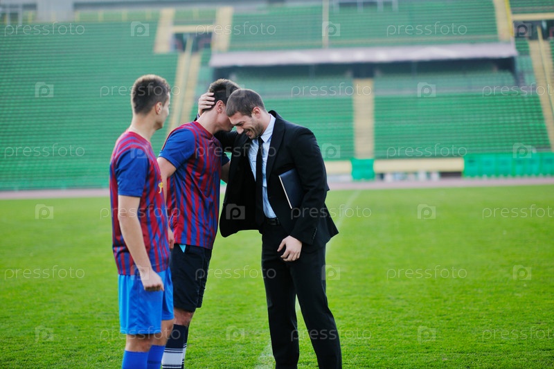 Спортивный менеджер в деловом костюме и футболисты на стадионе