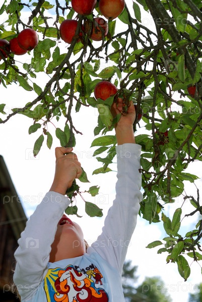 Девочка рвет яблоко с дерева