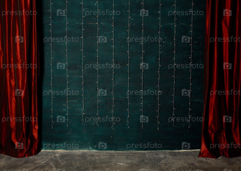 Красные шторы на фоне кирпичной стены
