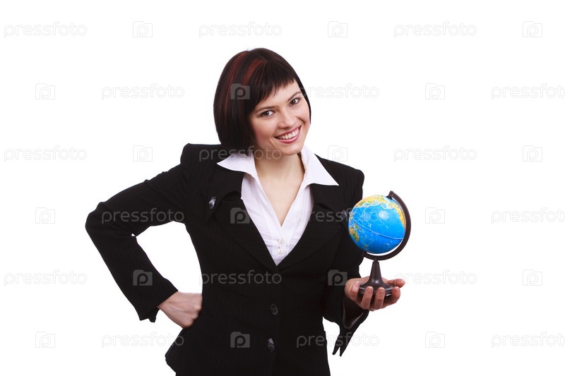 Деловая женщина держит земной шар в руке, изолированный на белом. привлекательная деловая женщина держит миниатюрный глобус. я дам тебе мир