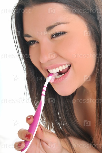 Портрет красивой девушки с зубной щеткой на белом фоне