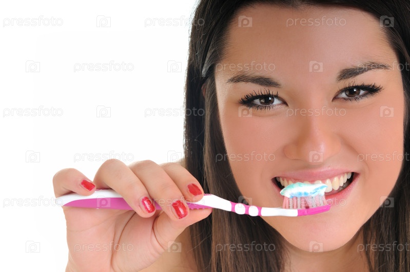 Портрет красивой девушки с зубной щеткой на белом фоне