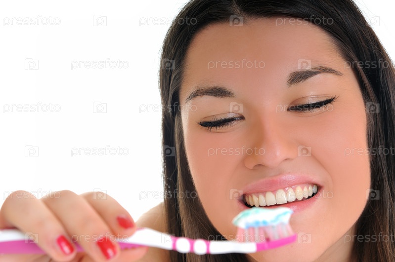 Портрет красивой девушки с зубной щеткой на белом фоне