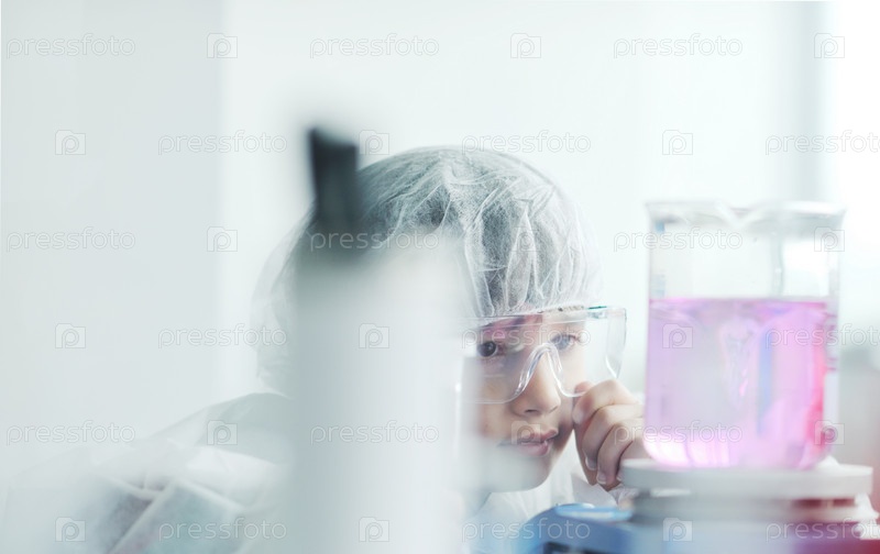 Маленький мальчик с пробирками в современной лаборатории
