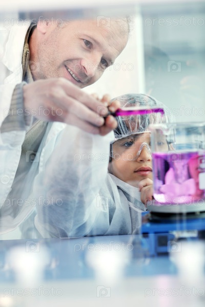 Занятия мальчика с учителем в химической лаборатории