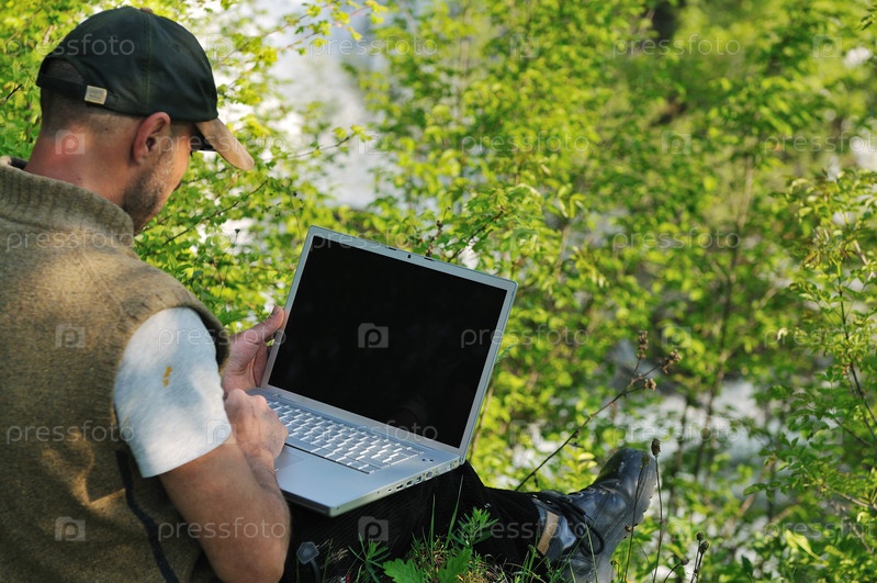 Молодой предприниматель работает на ноутбуке на природе