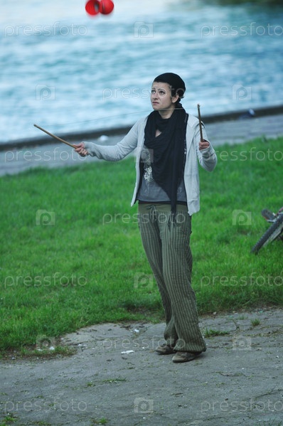 Девушка в простой одежде с палочками для дирижирования стоит в парке