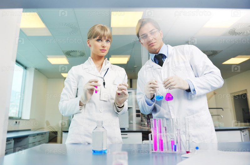 Двое молодых ученых проводят исследование в лаборатории