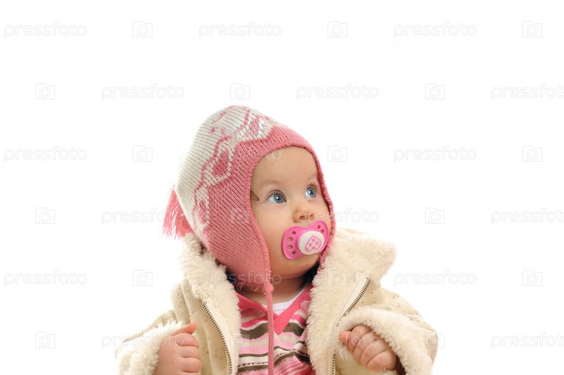 Маленький ребенок с соской в вязаной шапке на белом фоне