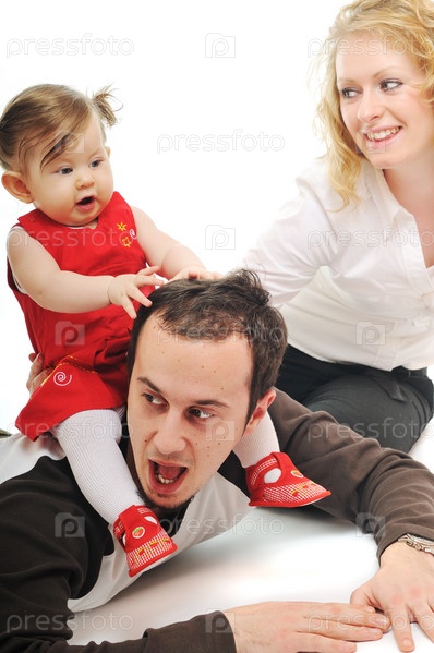 Молодая счастливая семья, студийный портрет, изолировано на белом фоне