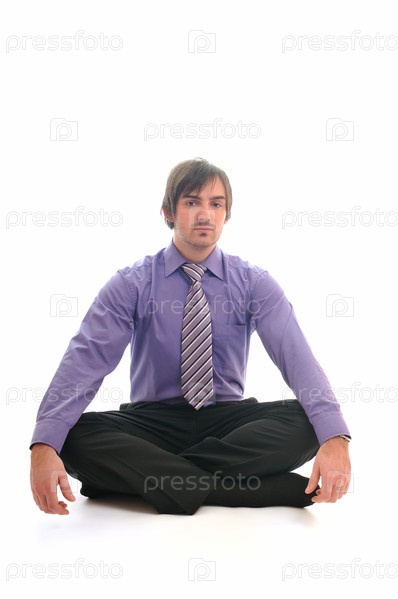 Деловой человек в позе лотоса, изолировано на белом фоне