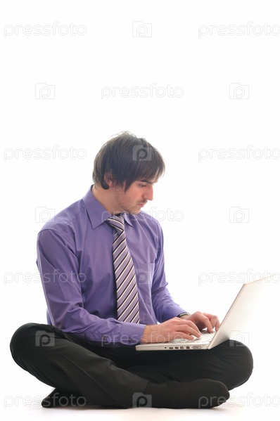 Молодой деловой мужчина с ноутбуком, изолировано на белом фоне