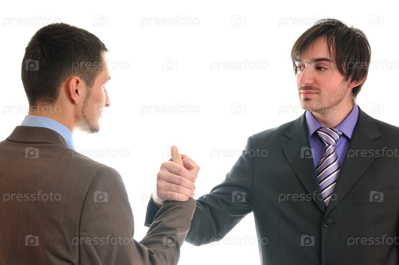 Встреча двух молодых деловых людей, изолированы на белом фоне