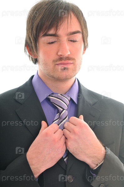 Портрет молодого делового человека в костюме и галстуке с закрытыми глазами на белом фоне