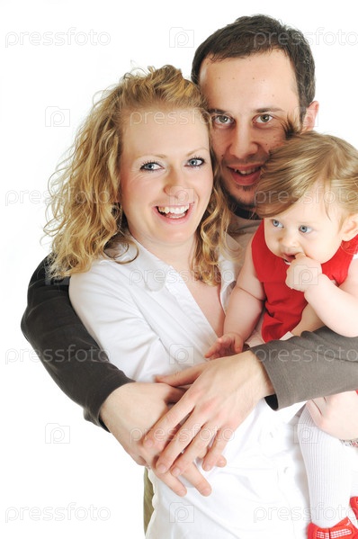 Молодая счастливая семья, изолировано на белом фоне