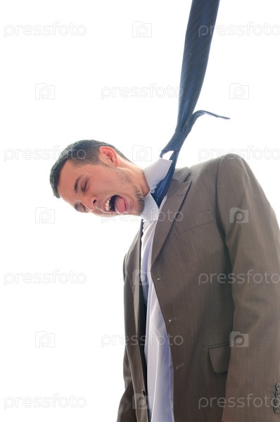 Молодой бизнесмен, повисший на галстуке, на белом фоне