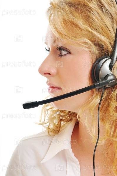 Молодая красивая деловая женщина с гарнитурой на белом фоне