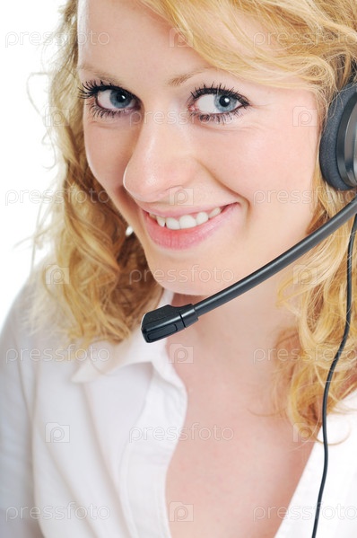 Молодая красивая деловая женщина с гарнитурой на белом фоне