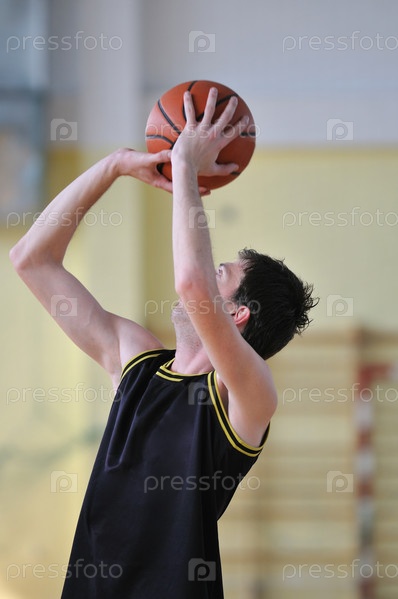 Молодой мужчина играет в баскетбол в школьном спортивном зале