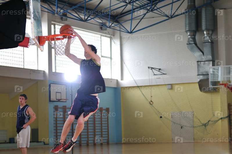 Баскетболисты играют в школьном спортивном зале