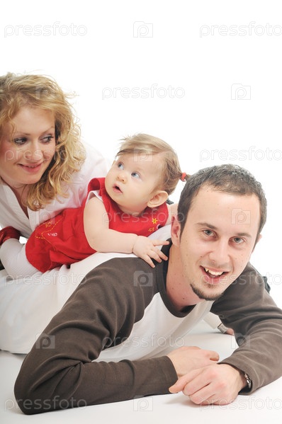 Молодая счастливая семья, изолировано на белом фоне