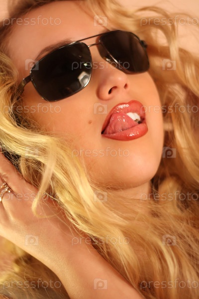 Красивая девушка с длинными светлыми волосами в черных очках показывает язык