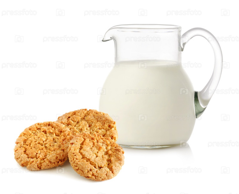 Стеклянный кувшин с молоком и печенье на белом фоне